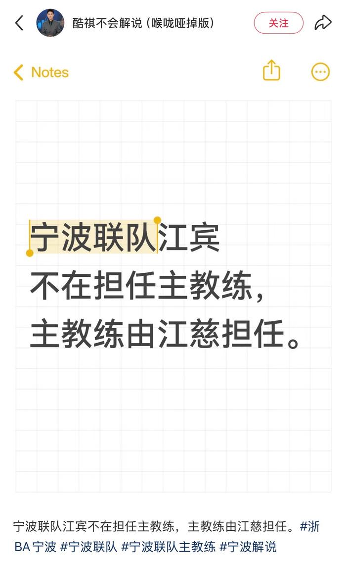 #浙BA宁波队主教练疑似更换为江慈# 网传浙BA宁波联队主教练换人,江宾不再担任主教练,主教练由江慈担任。